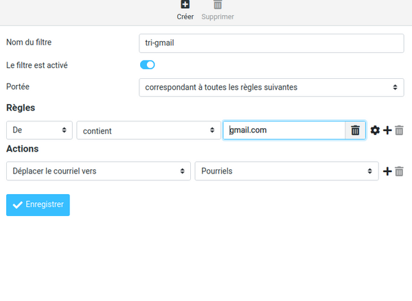 ici on filtre les mails qui contiennent l' adresse gmail.com et on les met dans un dossier.
