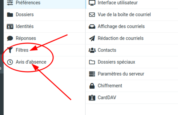 Pour les filtres de mail il faut retourner dans préférences et choisir filtres.