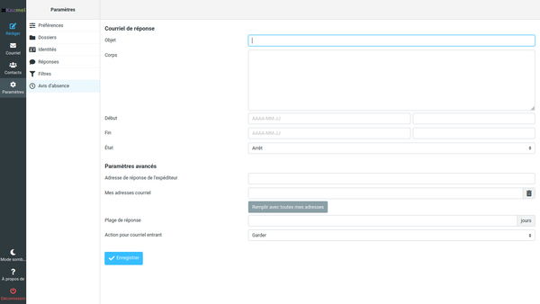 - Les paramètres avancés permettent de définir un adresse de réponse différente, ainsi qu' une action de conservation des mails ou non.