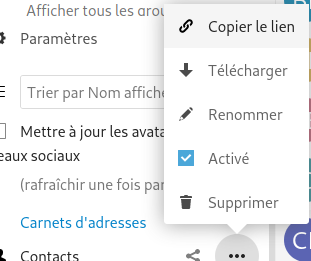 puis cliquer sur les 3 points en regard du carnet d'adresse à partager (généralement Contacts) et sélectionner copier le lien