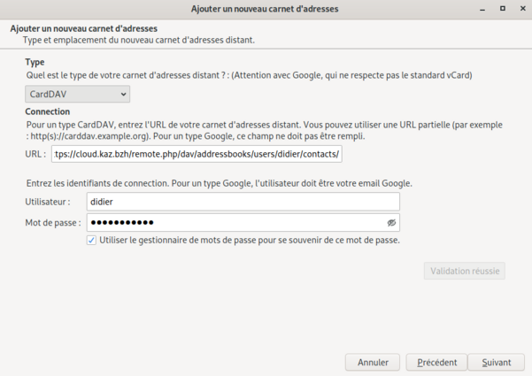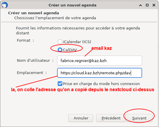 On renseigne les champs comme ceci ( avec le copier/ coller qu' on a fait dans les contacts de nextcloud précédement )