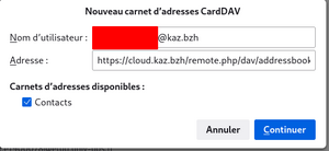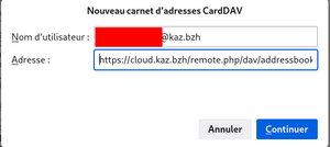Dans Url , il faut faire clic droit et coller ou faire CTRL + V Saisir son compte sur le cloud , ici c' est didier mais dans votre cas c' est l' adresse mail @kaz.bzh