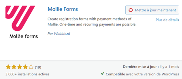 Mollie propose plusieurs applications pour différents sites et solutions web. A Kaz nous avons choisi le plugin Mollie Forms développé par https://wobbie.nl pour les sites Wordpress et que vous pouvez installer en recherchant les extensions Mollie (Menu Extensions/ajouter de Wordpress).