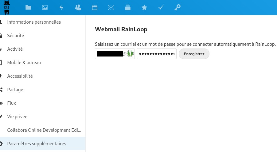 C'est que l'authentification initiale ne devait pas être la bonne. Il faut se déconnecter puis s'authentifier avec contact.XXX@kaz.bzh. Il n'y a plus qu'à lancer snappymail et il prend le compte nextcloud. Si vous souhaitez utiliser un compte de messagerie qui ne correspondant au nom de connexion, il faut changer les paramètres de snappymail.