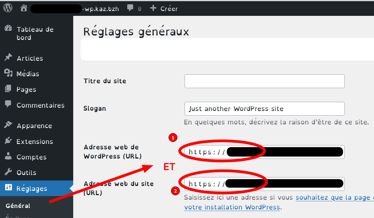 Pour la troisième étape, vous devez vous connecter comme administrateur sur votre site (l'ancien lien https://mon-orga-wp.kaz.bzh) et modifier les “URL” par défaut en indiquant votre domaine.